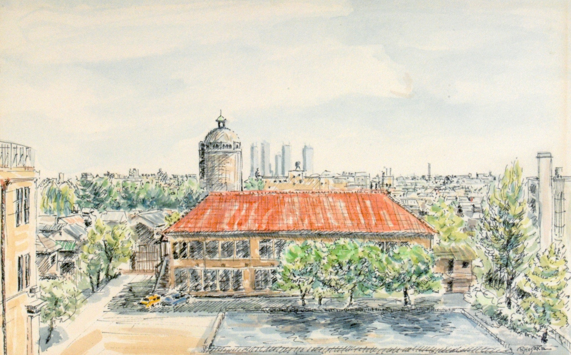 病院玄関から水道タンクを望む
