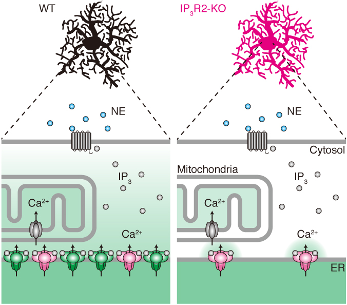 アストロサイトは、細胞内Ca2+シグナルを介して様々な脳機能制御に関与しています。このCa2+シグナル形成に2型IP3受容体(IP3R2)が主要な役割を果たすと考えられて来ました。実際、IP3R2ノックアウト(KO)マウスではアゴニスト刺激によるカルシウム濃度上昇が強く抑制されます。ところが、IP3R2-KOマウスには目立った生理機能変化が見られない例が報告され、アストロサイトCa2+シグナルの機能的な意義が疑問視されるようになりました。