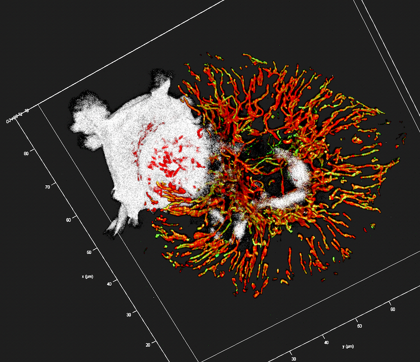 特に、エクソソームを使った遠隔的な細胞間情報伝達や、ナノチューブを介した近距離での細胞間伝達に注目しています。次の写真は、蛍光色素で細胞質を緑に、ミトコンドリアを赤に染めた羊膜上皮細胞が近隣の細胞にミトコンドリアを分配する現象を捉えたものです。