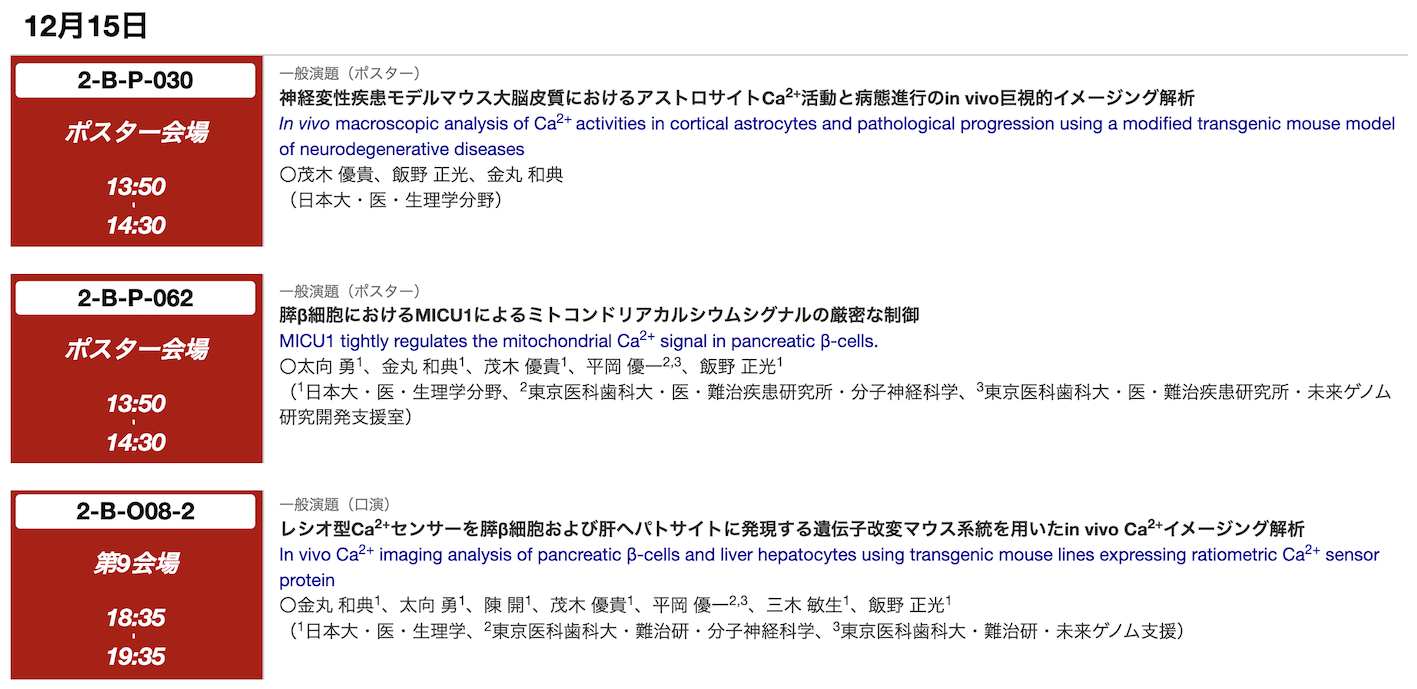 金丸准教授が代表者として開催した生理研研究会「細胞内カルシウムおよび細胞内・外シグナル分子の動態解析と計測技術の先端的研究(通称: カルシウムオタクの会)」@東岡崎、生理学研究所。谷田部君、太向助教、茂木PDが発表、懇親会では飯野先生が乾杯のご挨拶をされました。