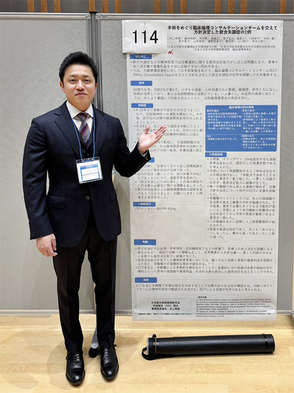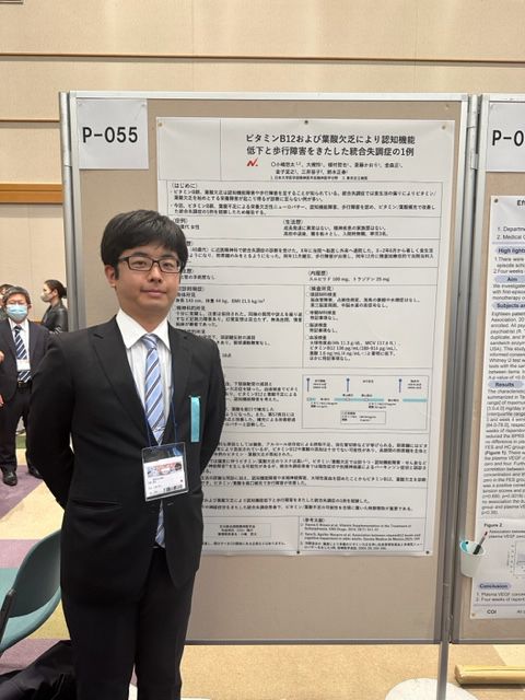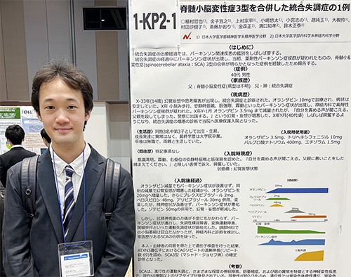 2023年6月23日、当科入局2年目の植村哲也先生が「脊髄小脳変性症3型を合併した統合失調症の1例」という題名で第119回精神神経学会学術総会にてポスター発表を行いました。本邦で統合失調症に脊髄小脳変性症3型(Machado-Joseph病)を合併した報告はこれまでなく、多くの参加者から質問やコメントを頂きました。