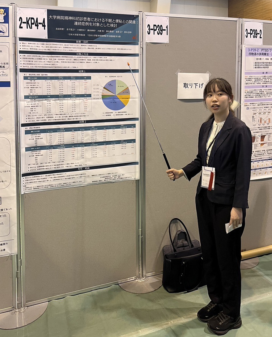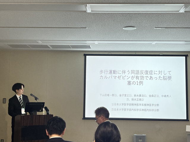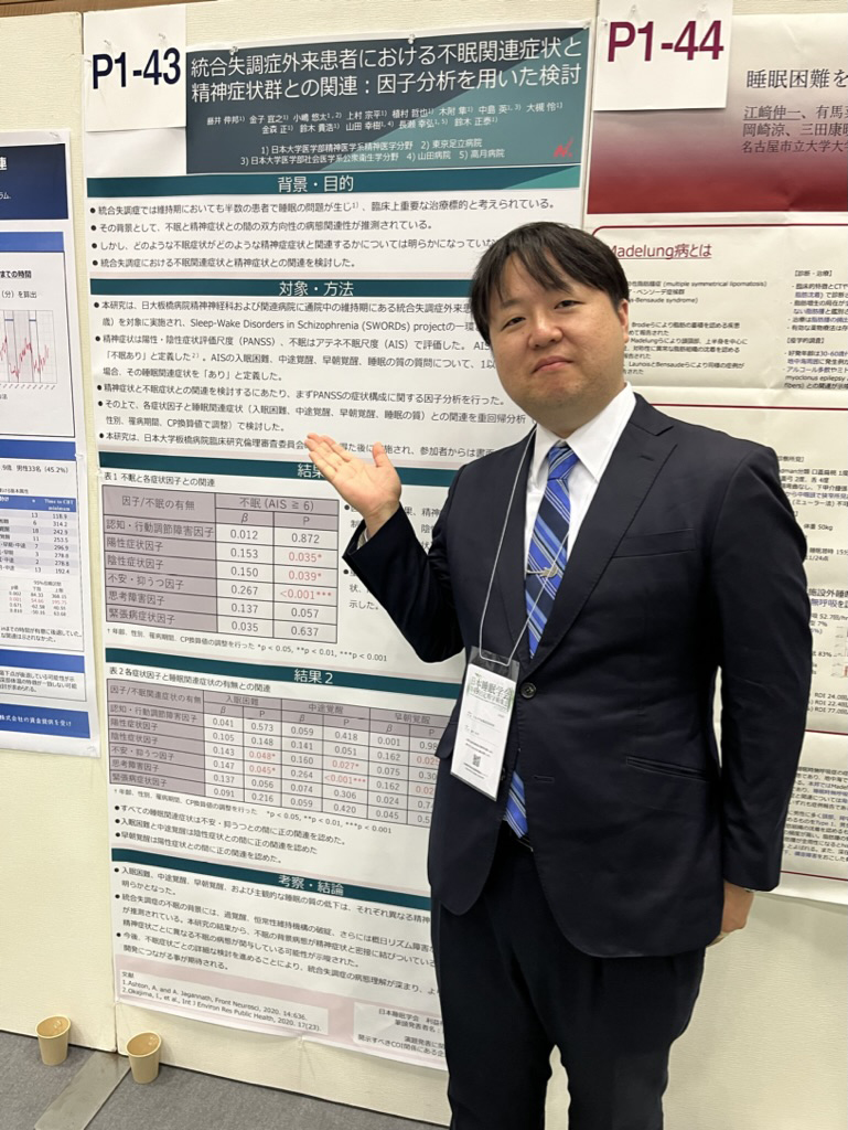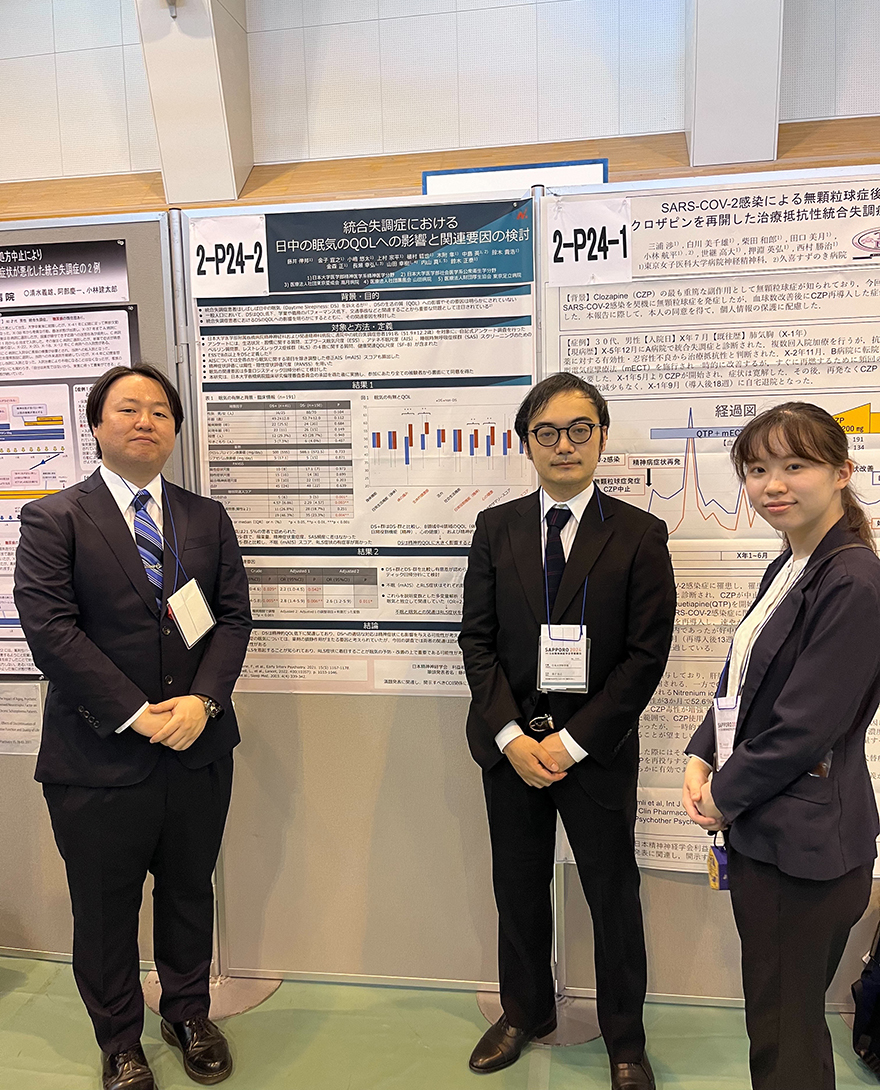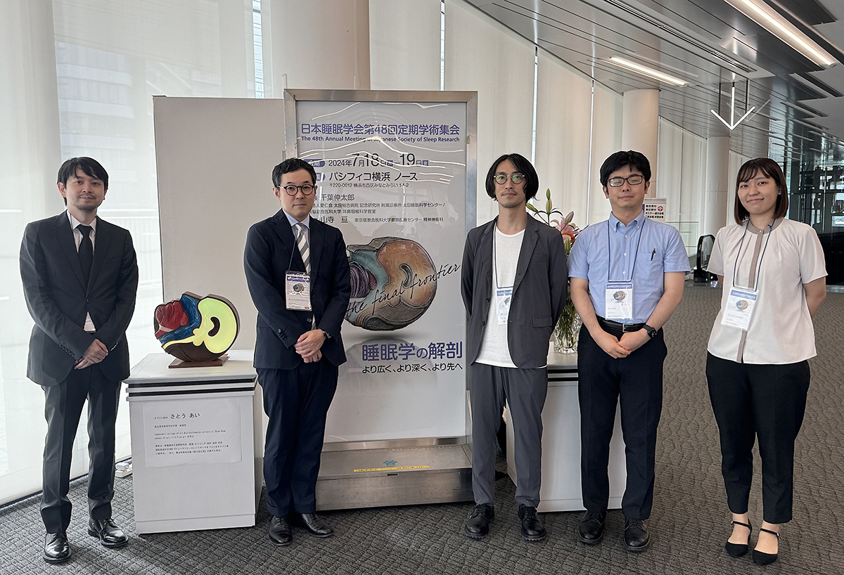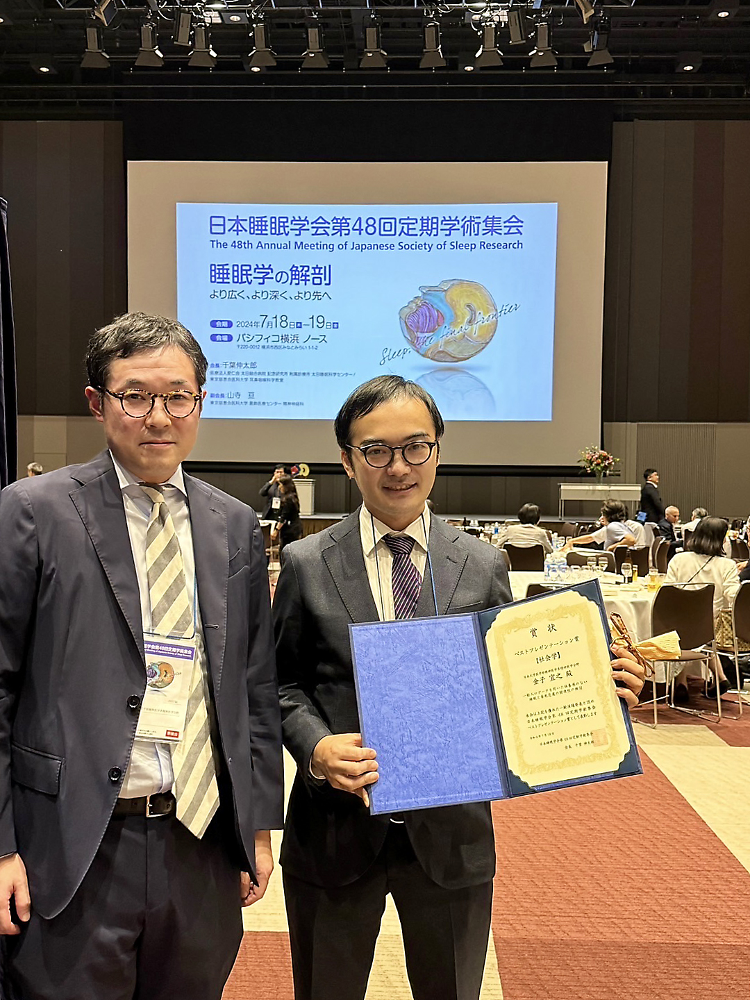 2024年7月18〜19日にパシフィコ横浜ノースで日本睡眠学会第48回定期学術集会が開催され、多くの教室員が参加しました。金子宜之先生と木附隼先生は、日頃の研究・臨床の成果を一般演題として発表し、大槻怜先生は久留米大学の小曽根教授と当教室の鈴木教授が座長を務められた「精神疾患に伴う睡眠障害に対する非定型抗精神病薬の新しい使い方と可能性」というシンポジウムで、これまでの臨床研究の成果を発表しました。金子先生は今回の大会でベストプレゼンテーション賞を受賞し、授賞式では参加した教室員一同で喜びを分かち合い、今後の研究活動に対する更なる意欲を高めました。