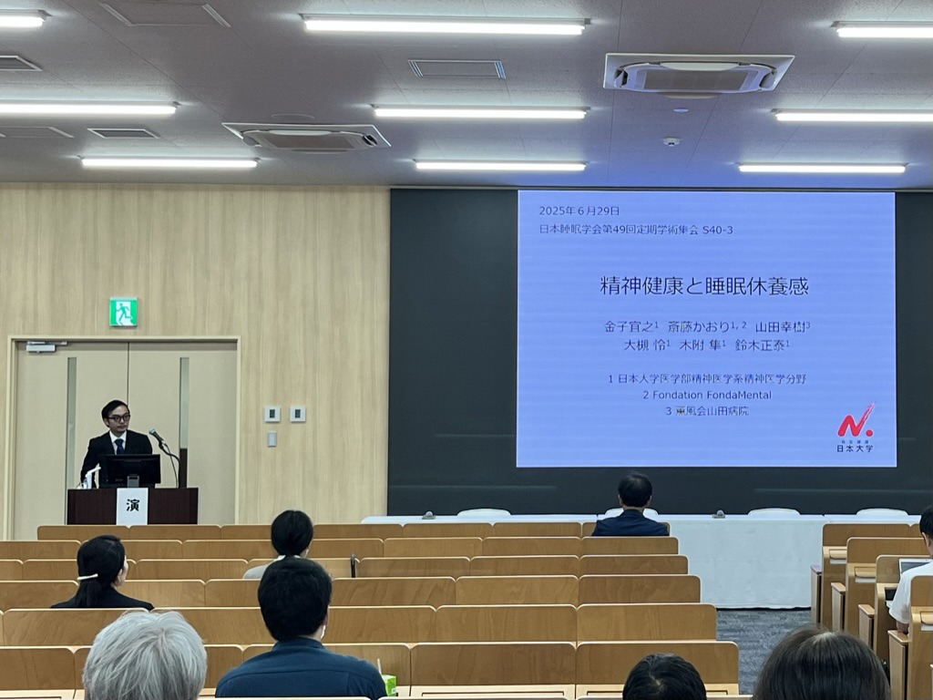 2025年6月28日、29日に広島で開催された日本睡眠学会第49回定期学術集会に、多くの医局員が参加しました。金子宜之先生は、NCNPの栗山健一先生と鈴木教授が座長を務めたシンポジウム「睡眠休養感と心身の健康 ―最近の知見と公衆衛生向上のための戦略―」において登壇し、我々の研究成果を含め、最新の知見について発表しました。また、藤井伸邦先生と、現在NCNP病院に国内留学中の不破真衣先生は、それぞれの臨床研究成果を報告し、参加者と活発な意見交換を行いました。鈴木教授が登壇された睡眠学基礎セミナーおよびランチョンセミナーには、多くの聴講者が参加され、関心の高さが窺われました。また、当教室所属の心理職スタッフもCBT-Iセミナーに参加し、認知行動療法に関する技法について学びました。