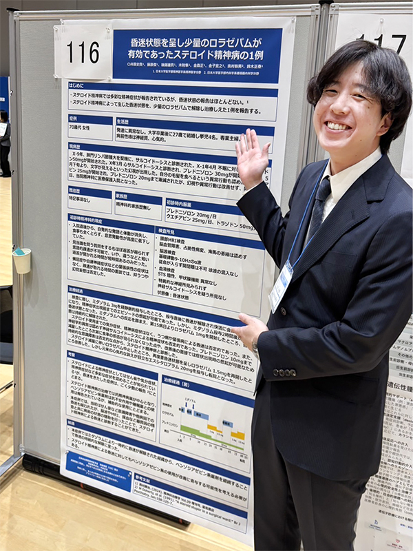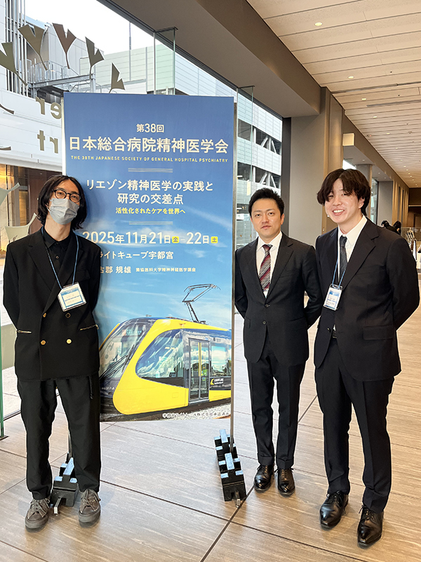 2025年11月21日、22日にライトキューブ宇都宮で開催された第38回日本総合病院精神医学会において、複数の教室員が、日々の診療で得た知見を発表しました。佐藤洋一先生は、クロザピン誘発性の強迫症状にアリピプラゾールが奏功した2例を報告し、今後の治療戦略の可能性を示唆しました。井上翔登先生は、統合失調症患者の手術方針決定に臨床倫理コンサルテーションチームが果たした役割について報告し、多職種連携の重要性を示しました。井原史貴先生は、ステロイド精神病における昏迷状態が少量のロラゼパムで改善した症例を紹介し、治療選択の一助となる知見を提示しました。学会を通じて、総合病院における精神医療の実践と研究の両面で多くの学びを得る機会となりました。また、懇親会では、ゲストとして登場したギタリストのマーティー・フリードマン氏と記念撮影やサインをもらうといったエキサイティングなひと幕もあり、学会参加の醍醐味を味わう機会となりました。今後も本学会で得た知見を日々の診療へ活かしてまいります。