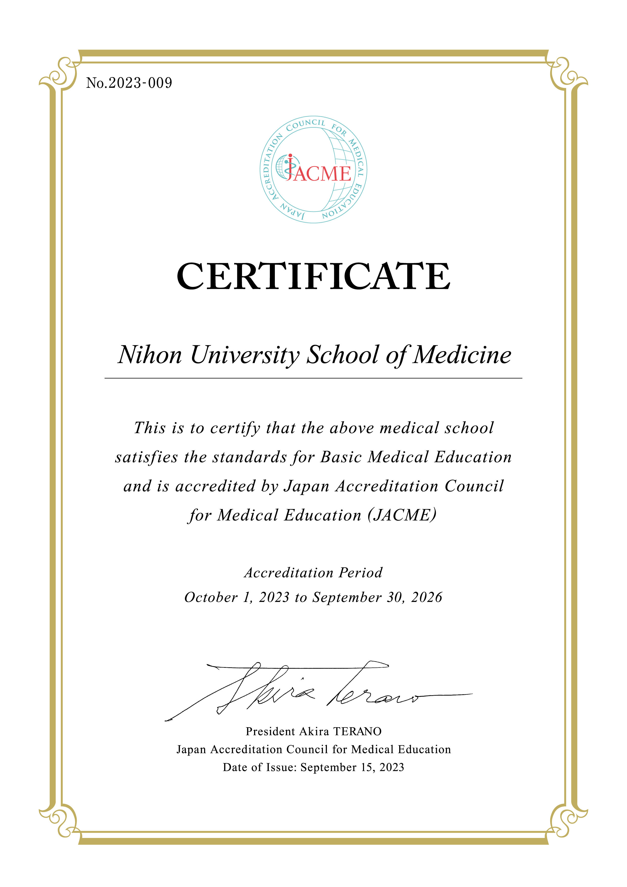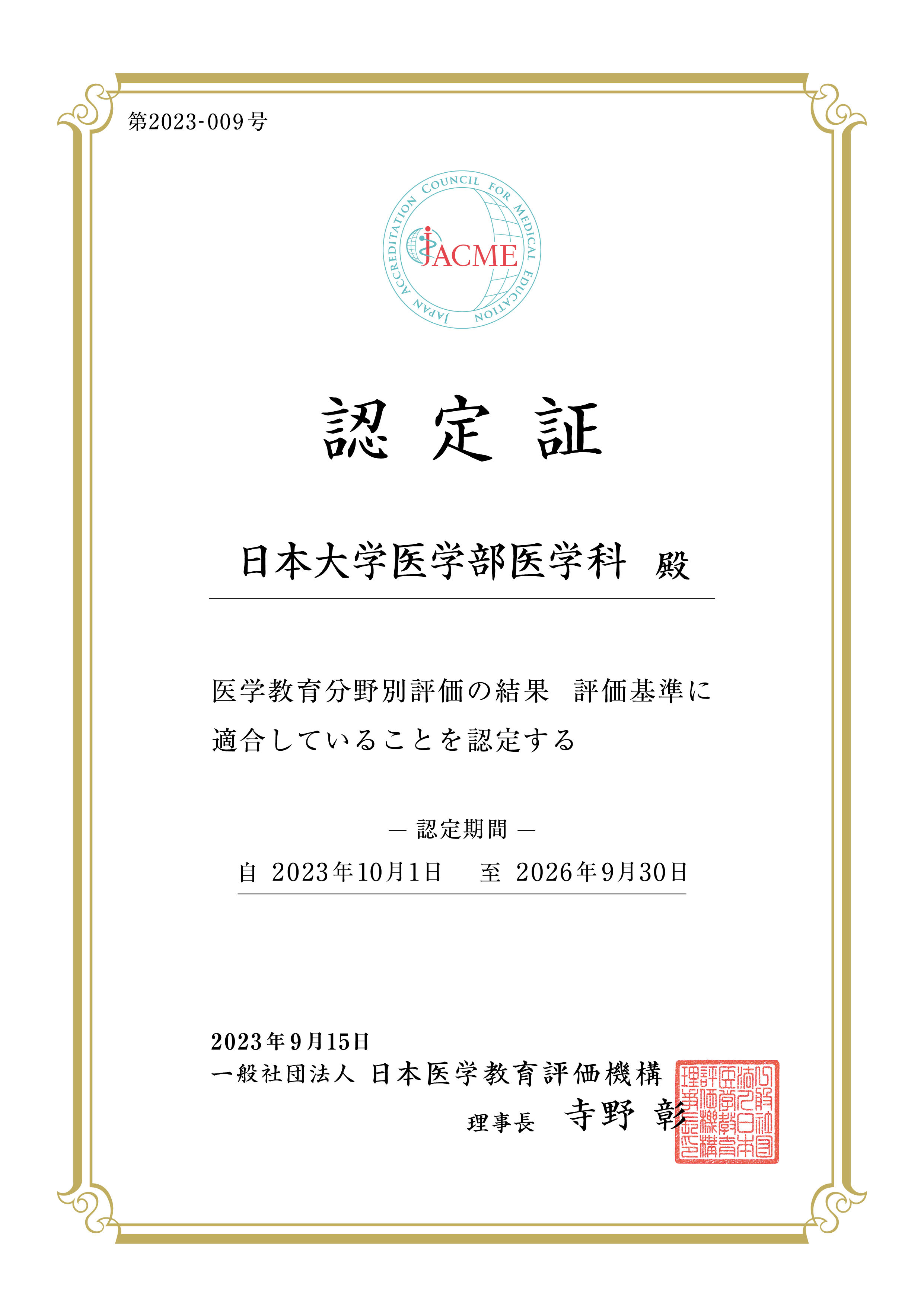 令和4年度に日本医学教育評価機構(JACME)による医学教育分野別評価を受審の結果、評価基準に「適合」していると認定されました。