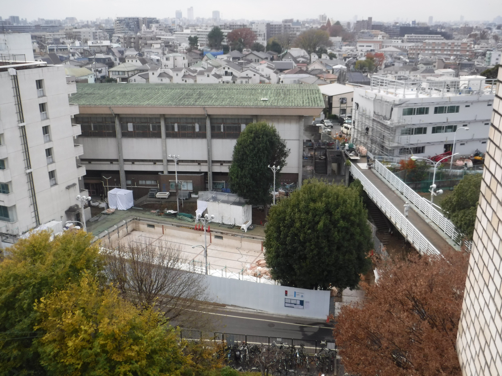 2号敷地(旧看護専門学校の校舎側)では,プール,体育館,社会医学一般教育棟の解体工事が始まりました。写真右側の建物は,看護専門学校の新校舎を建設中です。