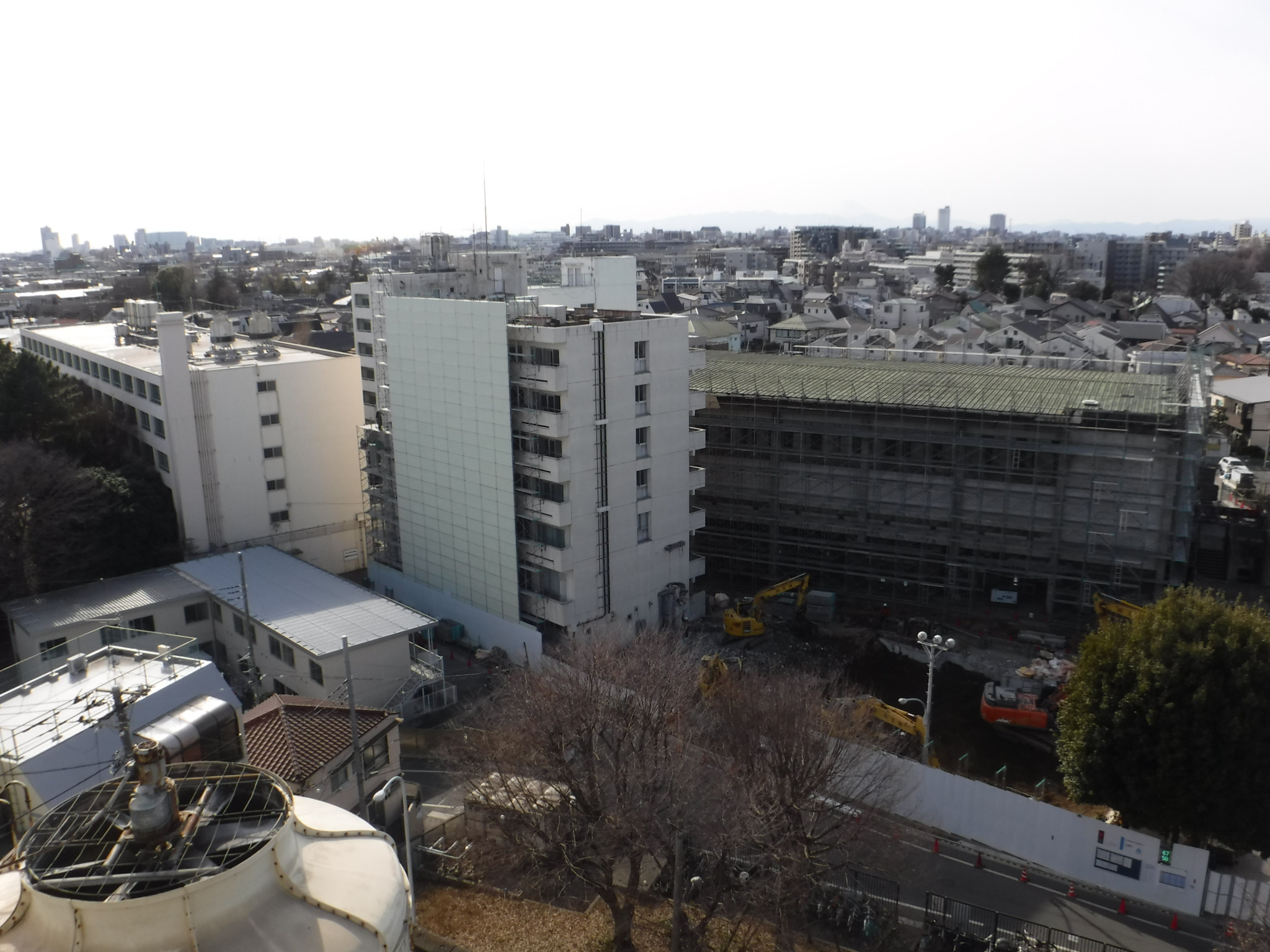 2号敷地(旧看護専門学校の校舎側)では解体工事が着々と進んでいます。プール跡地は地面の整地を行い,体育館は屋根回りの解体工事,社会医学・一般教育棟は防音パネルを設置中です。
