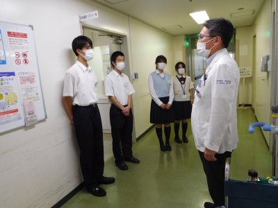 午後からはいよいよ医学部附属板橋病院での見学・実習に入りました。まずは、東京都の救命救急医療における当救命救急センターの役割や特徴について山口順子科長が分かりやすく説明し、施設を案内していきました。初療室においては、これから救急搬送されてくる患者を受け入れる救命救急センターのスタッフの緊張感を実際に感じることができ、集中治療室ではどのような治療が行われているのか、見学することができました。