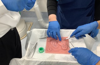 次に医学部動物実験室にて、外科的手技の体験実習を行いました。医学部研究支援部門の技術スタッフ2名の指導のもと、市販の鶏肉を用いて電気メスによる凝固・切開を体験し、さらに筋肉や皮膚の縫合や糸結びの練習にも取り組みました。最後には全員が縫合を習得することができました。