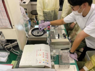 最後に、輸血・細胞治療センターの榎本雄也臨床検査技師による指導の下、血液型判定の実習を行いました。用意された課題には、赤血球表面の抗原と抗A、抗B血清の反応を調べる表検査と、既知の血球と血清中の抗A、抗B抗体を調べる裏検査が一致する一般的な検体だけでなく、一致しないまれな検体もありましたが、最初はやや緊張気味に取り組んでいました生徒たちも、全員が正しく判定することができました。